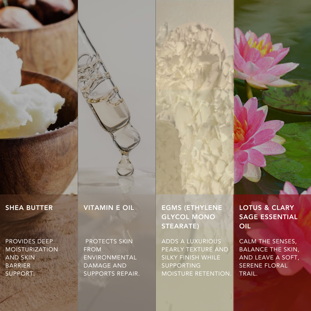 Alpha Olefin Sulphonate, SCI Powder (Sodium Cocoyl Isethionate), Aqua, Cocamidopropyl Betaine, Lotus Hydrosol (Nelumbo Nucifera), Clary sage hydrosol (Salvia sclarea), Glycerine, Sodium Lauryl Sulfate, Ethylene Glycol Mono Stearate, Cocomonoethanolamide, Coco Glucoside, Lauryl Glucoside, Stearic Acid, Cetyl Alcohol, Rice bran oil (Oryza Sativa), Shea butter (Butyrospermum Parkii),Lotus Essential oil (Nelumbo Nucifera), Clary sage Essential oil (Salvia sclarea), Olive oil (Olea Europaea), Castor oil (Ricinus Communis), Sodium Gluconate, Lactic acid, Sodium lactate, Vitamin E oil (Tocopheryl acetate), Broad spectrum Preservative.