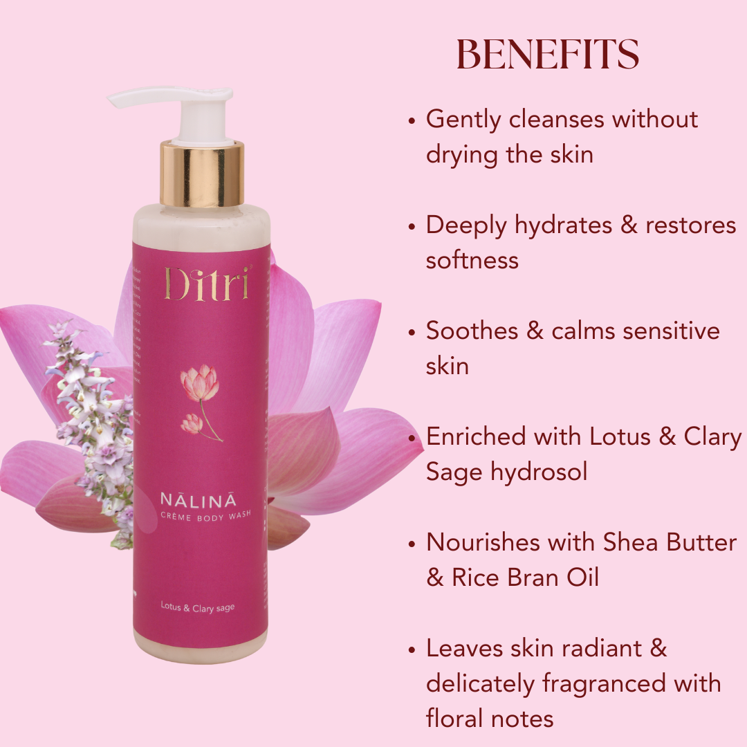 Nalinā Crème Body wash is a gentle, luxurious cleanser enriched with Lotus and Clary Sage Hydrosols, Shea Butter, and Rice Bran Oil. It creates a rich, creamy lather that hydrates and soothes the skin without stripping moisture. Infused with essential oils, Vitamin E, and botanical extracts, it leaves skin soft, radiant, and delicately fragranced with calming floral notes.