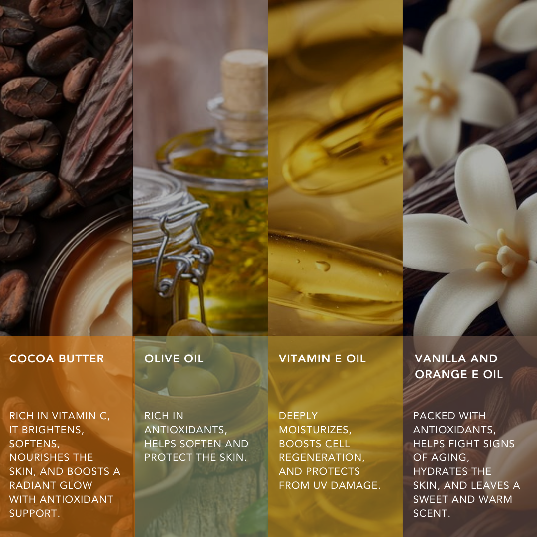 - Cocoa Butter – Provides deep moisturization and nourishes the skin.